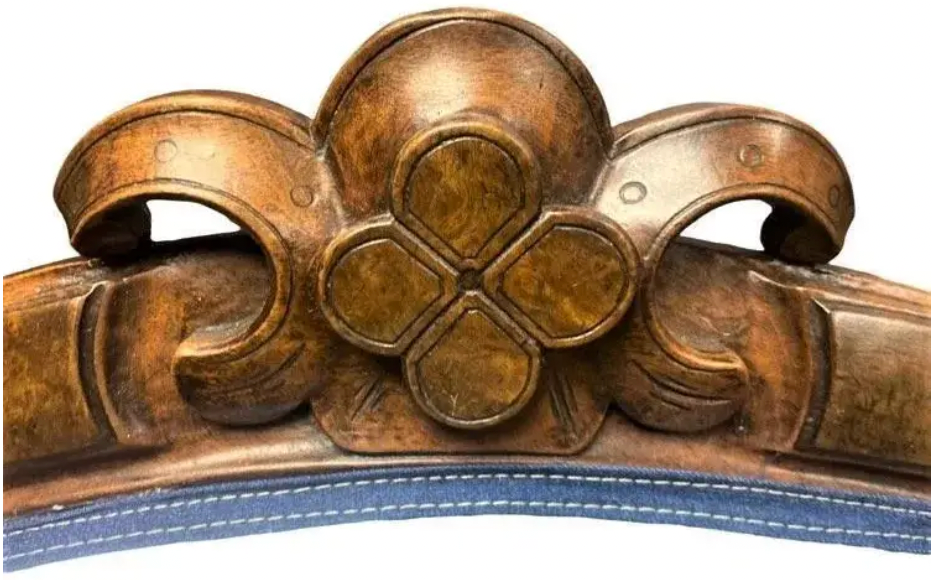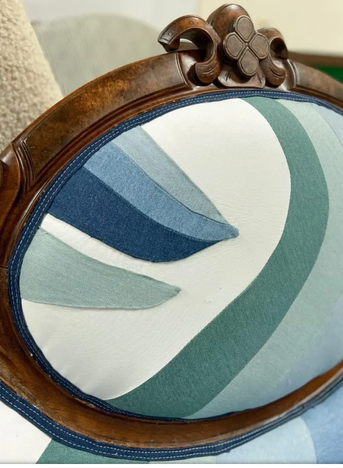 We used different colors of new denim to remake this sofa. As piping, we use a French seam made with denim that looks like it could be on a pair of jeans. The amazing graceful walnut frame with burlwood detail was completely restored and refinished too.